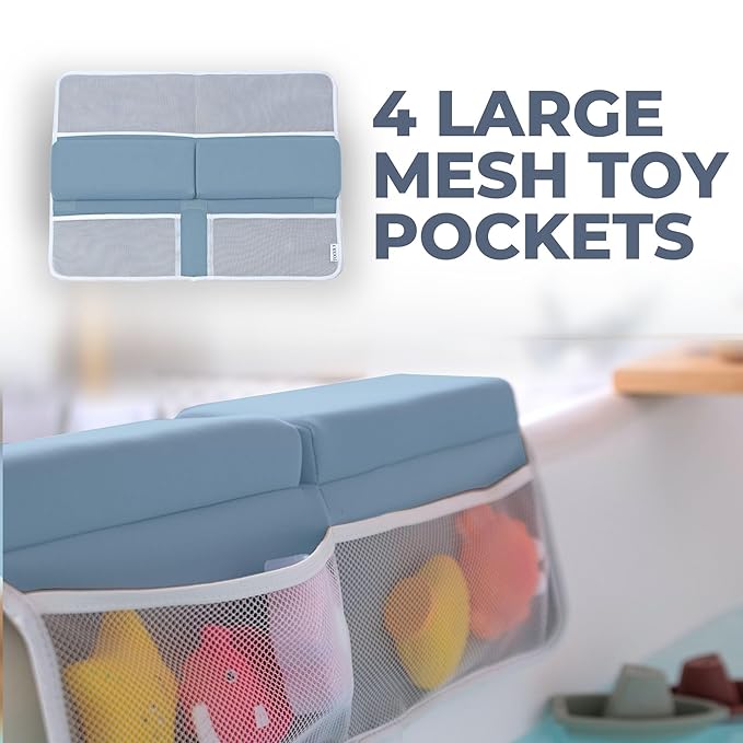 • POCKETS FOR BABY BATH ESSENTIALS: With 4 breathable organizer pockets, our bath mat for baby bath time will perfectly complement your routine. A handy solution for baby bath toys as well!