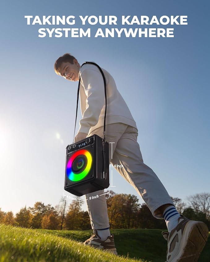 • Ultimate Portability: Take the party wherever you go with the portable outdoor speaker. Featuring a leather carry handle and a shoulder strap, it's easy to carry around. Plus, with its fully charge, you can enjoy 4-6 hours of non-stop singing, making it perfect for outdoor gatherings, upstairs parties, or even on-the-go karaoke sessions.