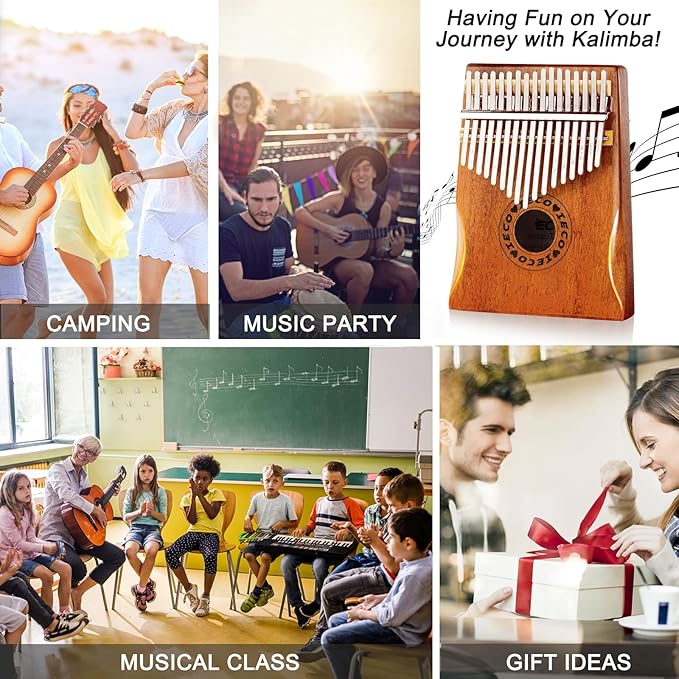 • Ideal Musical Instruments Gift: Come with everything you need: kalimba 17 key, tune hammer, songbook, instruction book, finger protectors, tune stickers, kalimba flannelette bag, and a cleaning cloth. Suitable for beginners, kids, and professionals