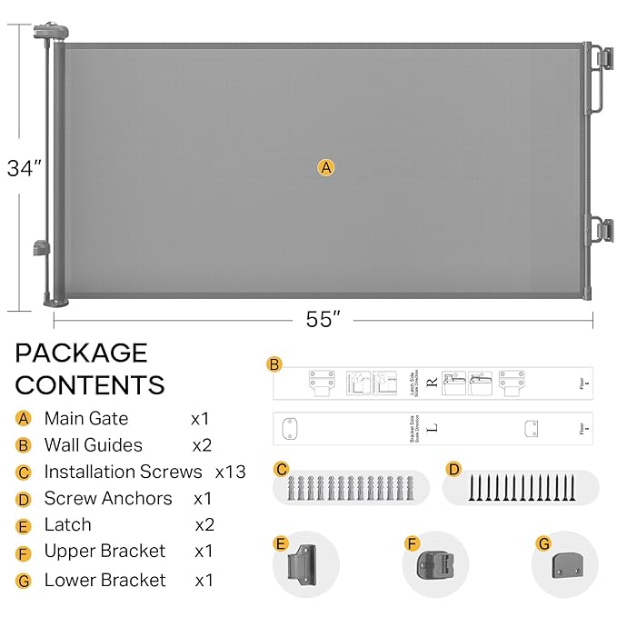 • Easy Hardware Installation: With the tools provided, you can have your new mesh retractable gate installed in minutes. Brackets, wall anchors, and screws make installation a hassle-free process. (Note: Not suitable for metal surfaces. When mounting to drywall, always anchor the screws into a stud for a secure and safe installation.)