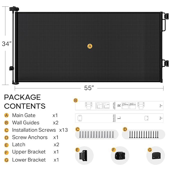 • Easy Hardware Installation: With the tools provided, you can have your new mesh retractable gate installed in minutes. Brackets, wall anchors, and screws make installation a hassle-free process. (Note: Not suitable for metal surfaces. When mounting to drywall, always anchor the screws into a stud for a secure and safe installation.)
