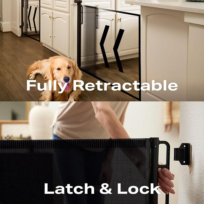 • New Safety Locking: The knob at the top of the mesh gate ensures that the retractable pet gate is easy to use for adults and can be opened and closed with one hand, while curious babies and pets will not be able to make any naughty bids for freedom. For best performance, remember to lock the latch after installation to fully tighten the mesh and ensure stability
