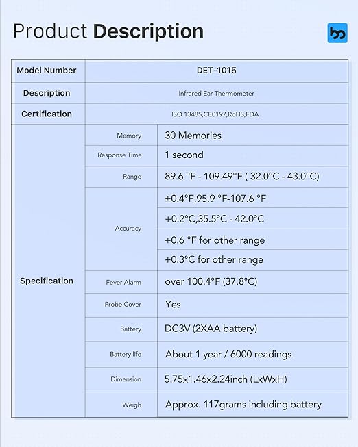 • Included Components : 1Γ—Ear Thermometer, 2Γ—AA Batteries, 24Γ—Probe Covers, 1Γ— Storage Bag, 1Γ—Manual