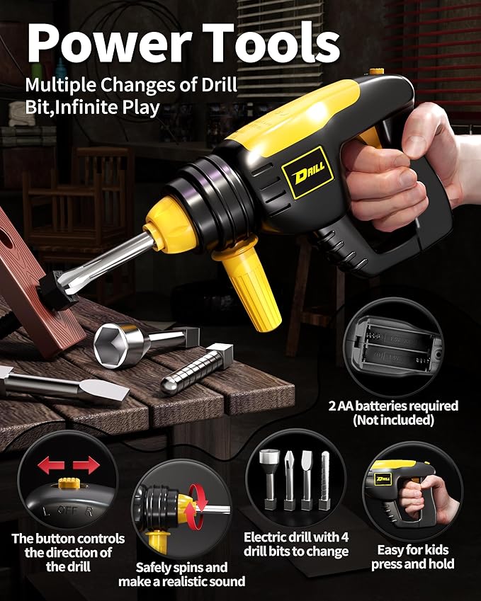• 【Electric Saws & Drills】The chain of a toy chainsaw rotates at a uniform speed, which is safe for children! The toys drill comes with 4 interchangeable drill bits for different functions, it only requires 2AA batteries that simulate sound and movements, which is more attractive and develop kids' imagination.