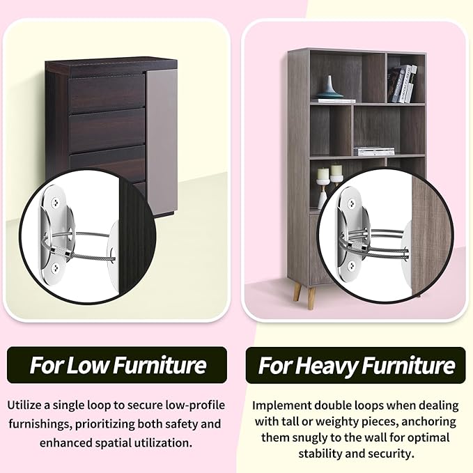 • Versatile Protection: Safeguard your space by anchoring furniture items such as bookcases, dressers, cabinets and wardrobes to the wall, effectively reducing incidents with curious toddlers. The detachable anti-tip anchor offers flexibility, allowing easy removal for cleaning or furniture repositioning.