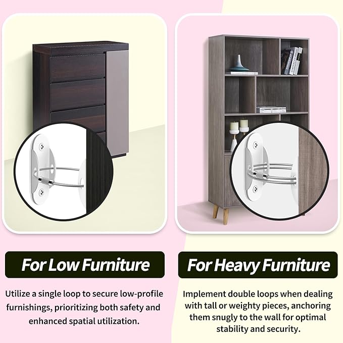 • Versatile Protection: Safeguard your space by anchoring furniture items such as bookcases, dressers, cabinets and wardrobes to the wall, effectively reducing incidents with curious toddlers. The detachable anti-tip anchor offers flexibility, allowing easy removal for cleaning or furniture repositioning.