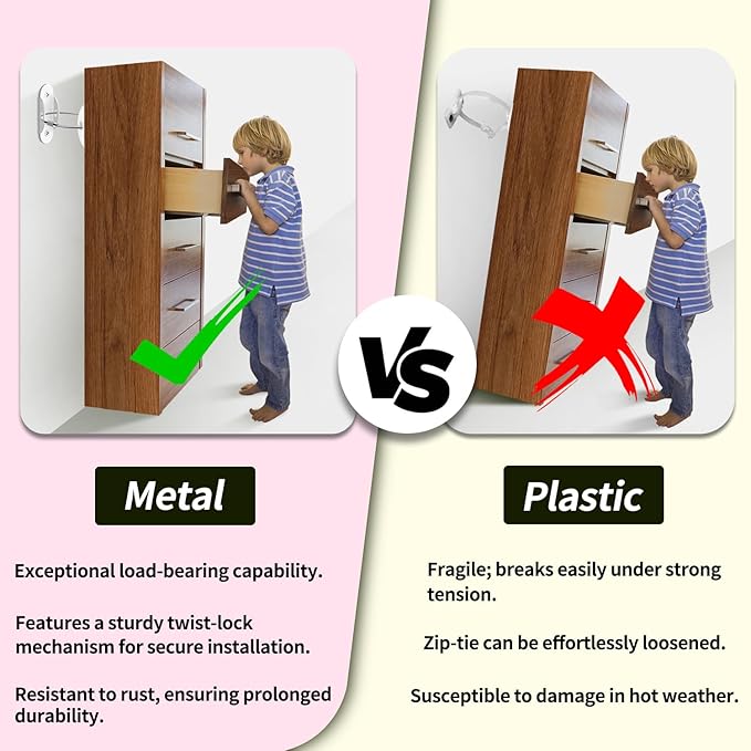 • Premium Material: Crafted from high-quality stainless steel, our baby-proof furniture anchors offer exceptional corrosion resistance and long-lasting defense against rust. Resilient against fire and heat, these anchors surpass plastic alternatives in durability, making them the ultimate guardian for your baby's safety.