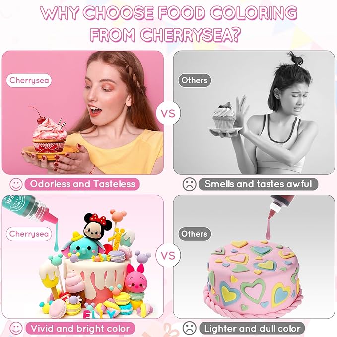 • Vibrant Cake Food Coloring - Approved by MSDS with food grade material.Non-toxic, dairy-free,nut-free,sugar-free and gluten-free. Food coloring set10 colors are odorless and tasteless.It doesn't change the taste of the food, just makes your desserts more lively and interesting. Any questions about how to add or use our baking food colors, please contact us via Amazon