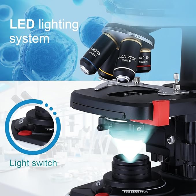 • [Combined magnification] 40X-2500X microscope, four rotating DIN achromatic objectives are 4X, 10X, 40X(S), 100X(S, Oil), with 10X and 25X eyepieces can magnify 40X, 100x, 250x, 400x, 1000x, 2500x
