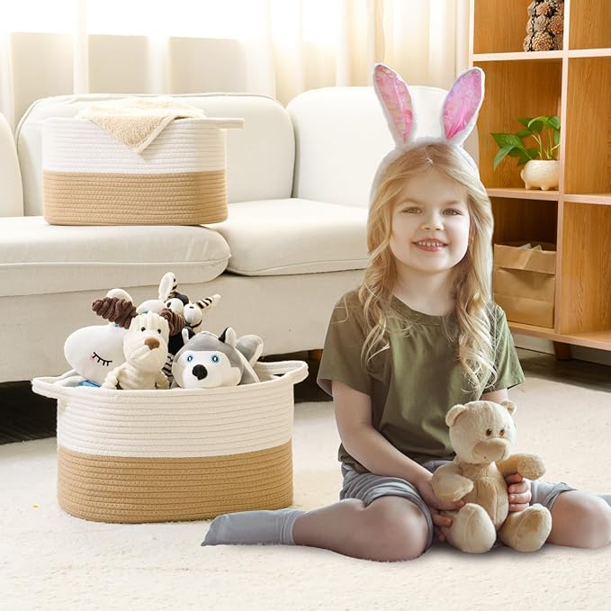 • 【Applicable】The woven basket can store children's products, such as children's toys, baby diapers, baby clothes, baby laundry basket,snacks, books, blankets, towels, and other baby products.It is the perfect storage basket for living rooms, bedrooms, bathrooms, baby rooms, miscellaneous rooms, playrooms, daycare centers, classrooms,warehouses, and storage rooms.The rope basket can also be used as a basket for home storage, organizing clothes and shelves, making your room cleaner and tidier.