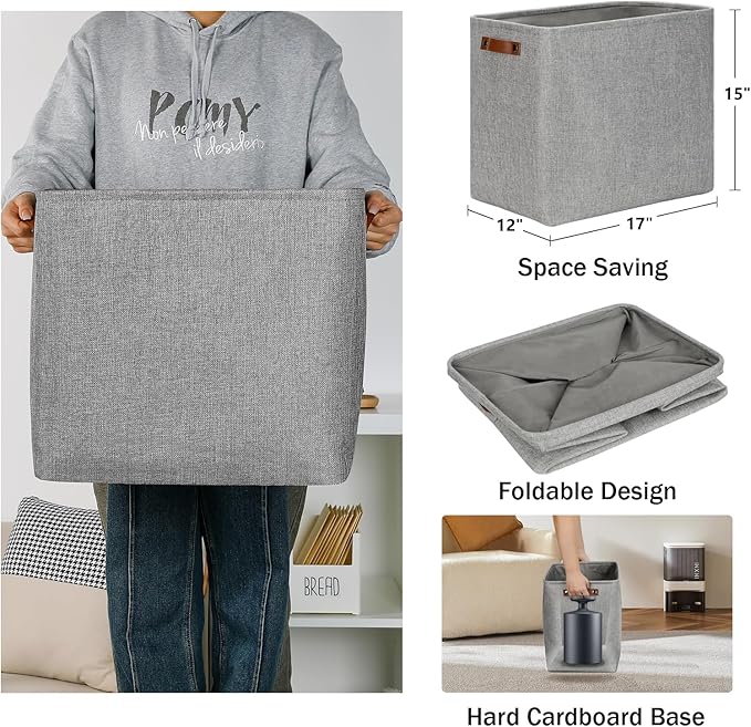 • 【Unique Design & Modern & Decorative】Set of 3 large storage baskets, dimensions(each): 17(L) x 12(W) x 15(H) inches. Collapsible storage baskets bring you organizing convenience and a sweet home. Great for socks, underwear, books, magazines, toys, baby clothes, pet products, wipes, towels, decorations, office supplies, DVDs, and gifts. The fabric baskets with neutral colors can match a lot of home styles - keeping your home nice and tidy.