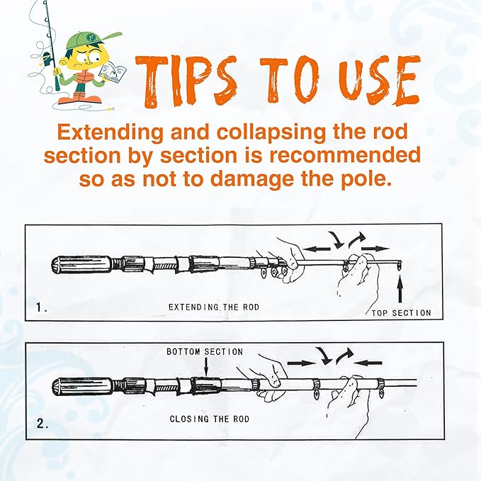 • Convenient Portability: Our collapsible fishing rod makes it easy to transport and store, and you can pack all your fishing accessories into one fishing bag, and you can take them wherever you want, and the fishing bag also provides added protection while on the go. Tips: Extending and collapsing the rod section by section is recommended so as not to damage the pole