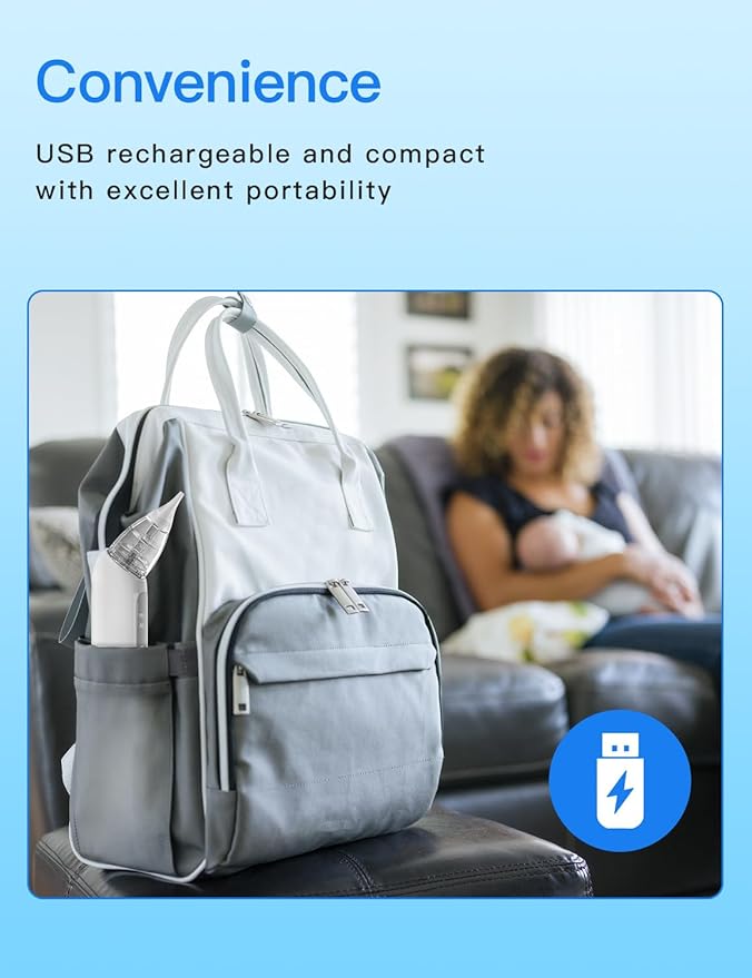 • Rechargeable and IPX4: The nasal aspirator supports USB charging and the IPX4 waterproof technology is designed to be splash-proof (not submersible), extending the life of the nasal aspirator.