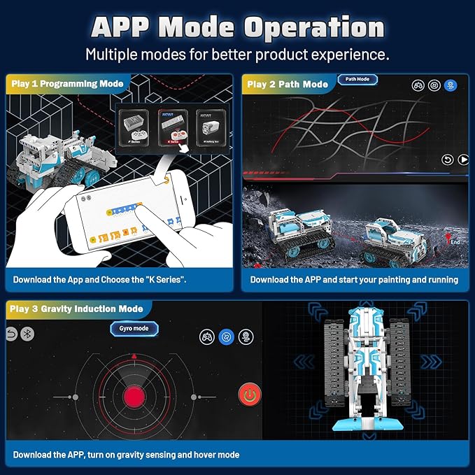 • Remote and App Control: Offering both remote control and app-based control with multiple movement options and 360° rotation stunts adds an extra layer of engagement and excitement to play. The inclusion of app control introduces programming concepts, helping children learn and develop valuable skills.(Remote control need 2AAA batteries: Don’t included).