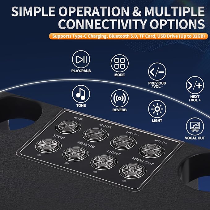 • [Explore diverse sound effects] The karaoke machine pa system boasts 6 unique voice effects: Echo, Original, Male, Female, Child, and Monster, adding unexpected creativity and entertainment to your performance. You can effortlessly switch between these effects using the bluetooth microphone or the buttons on the karaoke machine,. Unleash your creativity effortlessly