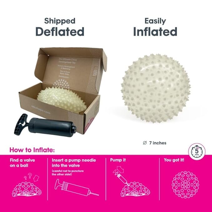 • WHAT'S INSIDE: A set includes one 7" Glow in the Dark Deflated with Pump sensory ball for toddlers 1-3. Our baby development balls come deflated but can be easily inflated via a built-in valve. Recommended for kids aged 6 months and up!