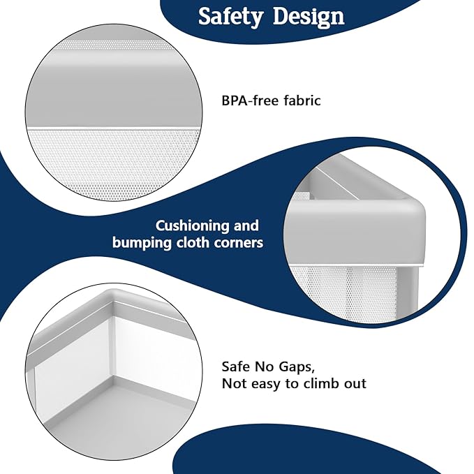 • SAFETY &HEALTH MATERIAL:Our baby playpen is made of safe and sturdy materials, skin friendly and non-toxic BPA-FREE fabric, thick plastic parts and stainless steel pipes, and bottom suction cups make it not easy to move. It no gaps, making babies not easy to climb out.Our baby play pen is designed to create a healthy and stable castle for babies, so you can use it with confidence.
