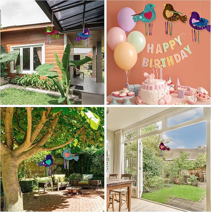 • COMPLETE DIY CHIME KIT: A set with enough accessories to create 8 melodic wind chimes! It includes 12 paint pots, 2 paint brushes, 1 rhinestone flower sticker sheet, 1 glitter heart foam sticker sheet, 32 metal chimes, 8 meters of silver string, and 8 wooden birds.