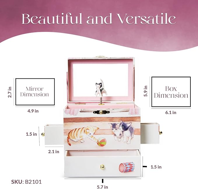 • 🧢 MULTI-FUNCTION: Not just a beautiful music box, this enchanting item contains multiple drawers to store trinkets and jewelry, seamlessly combining aesthetic allure and practical functionality. Our musical jewelry box measures 6 x 4 x 6 in. with 1 big compartment & a few hidden small drawers. This provides ample space to store all jewelry items and precious treasures in one place, creating a safe home for memories to be kept. You’re not just giving a jewelry box with a dancing kitty cat - you are encouraging organizational skills that any child will hold onto for years to come.