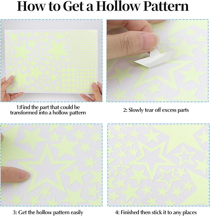 • Quality Luminous Material,Peel and Stick,Easy to Apply : The glow in the dark stars are made of high quality vinyl and luminous materials,nice and thick, waterproof.These stickers come with powerful backing adhesion,very easy to install,just peel-stick-install.The glow space wall decals can cling strongly to any surfaces for years.Also they are extremely easy to remove and reposition,but never hurt your wall and leave no residues when you don't want it