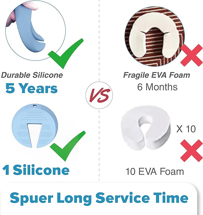 • ๐‹๐จ๐ง๐  ๐’๐ž๐ซ๐ฏ๐ข๐œ๐ž ๐“๐ข๐ฆ๐ž: Neobay finger pinch guard is made from durable silicone which can serve up to 5 years, about 10 times longer than foam door stopper. Perfect for continuously protecting the little hands and fingers of your baby, toddler, or child from getting pinched or jammed due to a door closing.