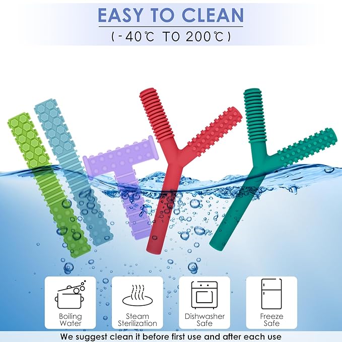• FUN TEETHING TOYS: Our sensory teething toys set includes 1 pcs T shaped, 2 pcs Y shaped sensory chewy toys and 2 pcs teething tubes, helps keep your kids from chewing on fingers, pencils, hands, clothes, hairs, etc. Reducing stress, anxiety especially when they need to soothe, calm, or focus