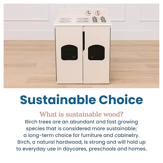 • Certified Safe: Institutional quality wooden play kitchen is GREENGUARD [GOLD] Certified for low VOCs, TSCA and CPSIA compliant; cut-out handles allow adults to pick up and transport