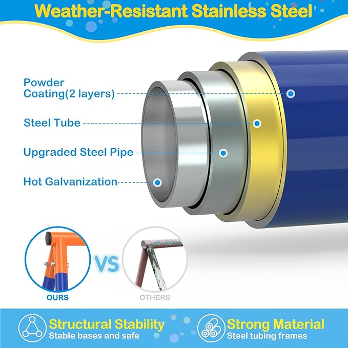 • Easy Installation and Weather Resistance: Setting up our swing set is a breeze with clear instructions and included hardware. The rust-resistant paint ensures reliable against the elements