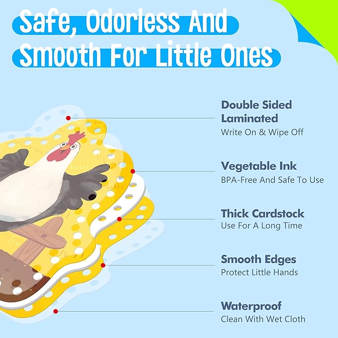 • Cute Patterns & Smart Designs: The pattern covers diverse farm animals, like cow, duck, rooster, hen, owl, sheep, monkey, frog and horse. The illustrations on cards are big, vivid and vibrant. The holes are clearly cut and easy for preschoolers to work with. The strings are easy for children to use and fit into the holes easily.