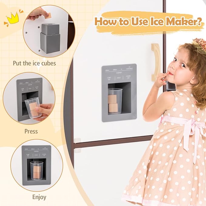 • Vivid Sounds for Realistic Effect: By rotating the knobs that make click sounds, kids can turn on the heat and learn to make delicious food for realistic cooking experience. What’s more, the ice maker also makes realistic sounds when pressed. But how to use it? Just put the ice cubes, press to get ice cubes and enjoy.