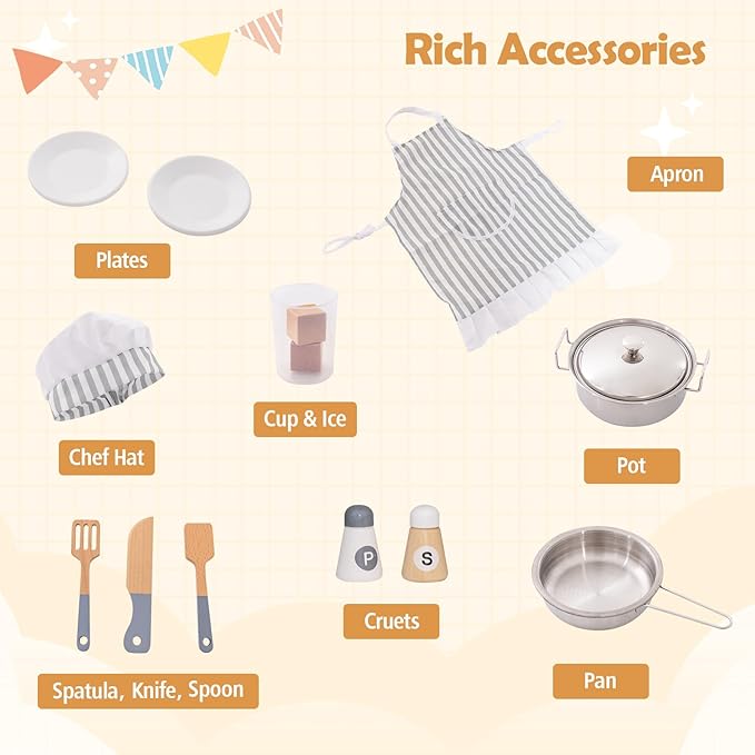 • Great Gift for Kids: This corner cooking toy set is designed for kids aged 3-10 who love to pretend cooking. The real cooking experience allows children to improve their hands-on ability, develop fine motor skill, inspire creativity and more during play. This toddler kitchen toy set is the perfect gift idea for any occasion.