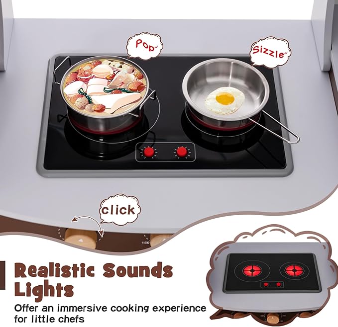 • Durable Corner Play Kitchen: This toddler kitchen playset is made with wooden structure with stable base, ensuring high stability and durability. Plus, it is certificated by ASTM and CPSIA for reliable use. And there are no sharp edges to protect your child's delicate skin. More, the L-shaped design makes it perfectly fit in kids room, play room or living room.