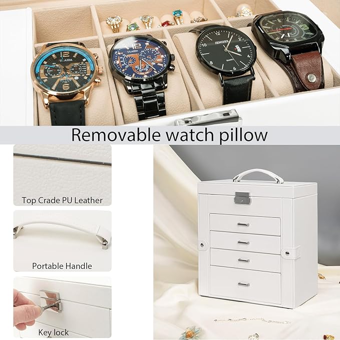 • 【LARGE CAPACITY,JUST TOP LAYER CAN BE LOCKABLE】:With 4 versatile pull out drawers, this white jewelry box can store jewelry accessories, such as rings, earrings, necklaces, chains, bracelets,Watches and so on. One deeper drawer is designed for large jewelries.There have a key to lock the top layer