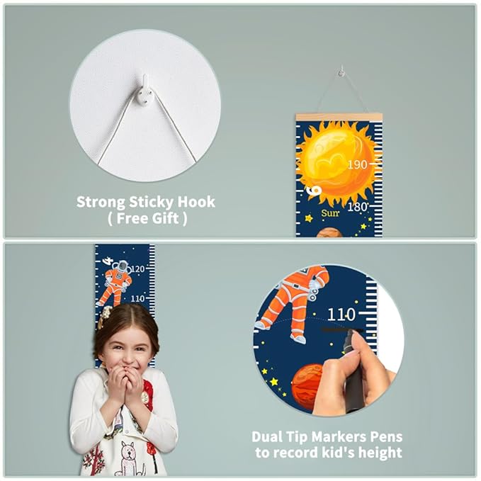 • HEIGHT CHART WITH TWO SCALES - Funny outer space astronaut planets patterns(sun, mercury, venus, earth, mars, jupiter, saturn, moon, uranus, nepture), and style with 2 accurate scales(feet and centimeter), convenient for you to see the detail clearly according to own habits.