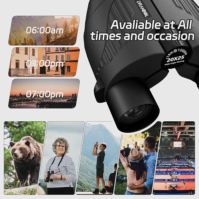 • [16mm Large Eyepiece and 20x High Magnification] Our 20x25 binoculars for adults with 16mm large eyepieces, which renders larger images and provide a more comfortable wide field of view, ensuring clear details without color distortion or blurring. 20x magnification allows you to observe complex features in the distance without losing sight of the target, allowing you to see everything in the distance without any effort.