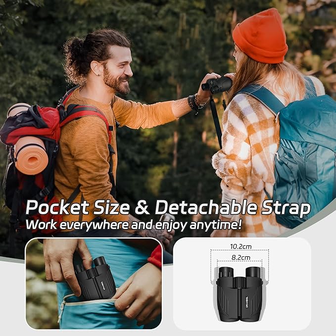 • [Ergonomic Design]Designed with ergonomics in mind, the compact binoculars has a size that fits comfortably in your hand. It features a rubber anti-slip strip on the front for shock absorption and slip resistance, while the back has a groove for your thumb to grip easily. It comes with a storage bag that can be attached to a belt and a wider and stronger neck strap, reducing the burden when wearing, and there is no need to worry about the strap breaking easily.