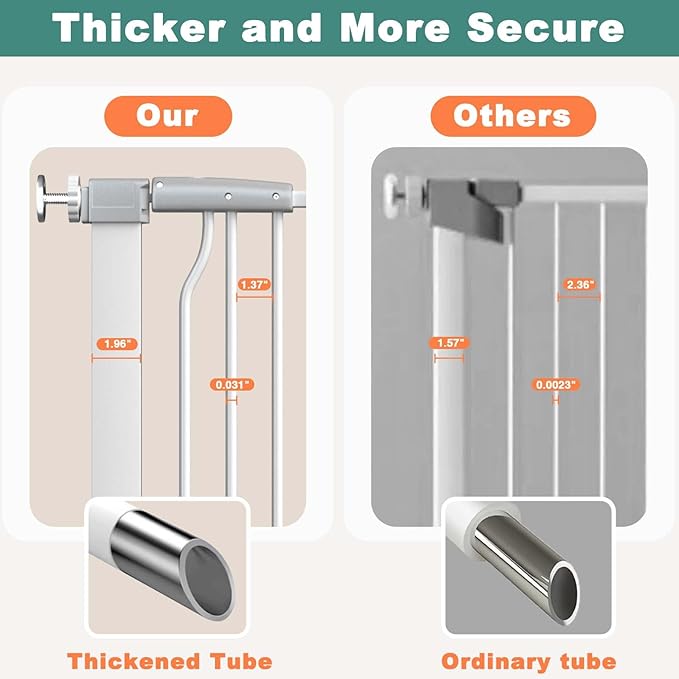 • 【1.37" Ultra Narrow Spacing】Metal tall dog gate indoor ultra-narrow gaps between each two bars are only 1.37", which effectively prevents pets and kids bodies or heads from getting stuck. What's more, extra tall pet gate has an upgraded thicker pipe wall, making it more solid and stable.