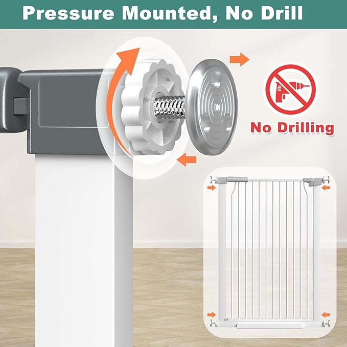 • 【Easy Installation】The pressure-mounted baby gate comes with adjustable pressure bolts, no tools required, no need to drill. You can easily install or remove the gate when needed without causing any damage to the door frame or walls. Tension baby gate is used for the house indoor outdoor.
