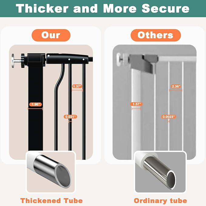 • 【1.37" Narrow Space】Metal adjustable baby gate indoor ultra-narrow gaps between each two bars are only 1.37", which effectively prevents pets and kids bodies or heads from getting stuck. Extra tall pet gate has an upgraded thicker pipe wall, making it more solid and stable.