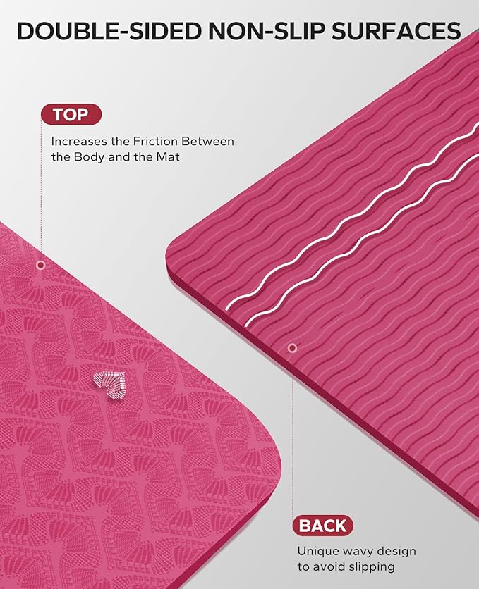 • Double-Sided Non-Slip Design: Our extra wide yoga mat features a double-sided non-slip surface to keep you stable and secure during your practice without worrying about slipping or sliding. The unique wave pattern on the bottom enhances grip on a variety of surfaces, ensuring your mat stays securely in place even during the most challenging yoga poses. Note:Not for use on carpet