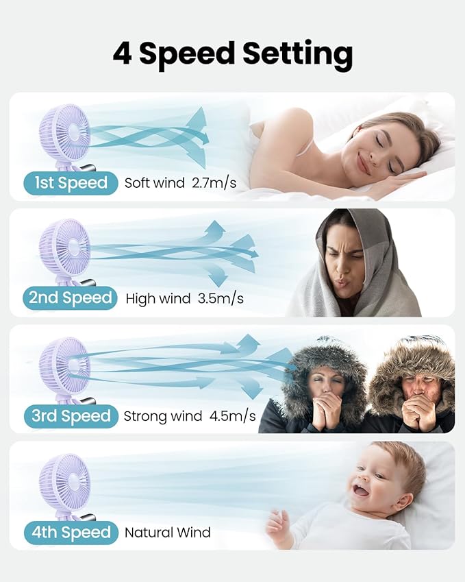 • 4 Adjustable Speeds and Quiet: Baby stroller fan has 4 speed settings: low, medium, strong, natural wind; The 4th speed make the usb fan run and stop for every 4 seconds, put off a good breeze; Quiet clip on fan is great for use with baby strollers