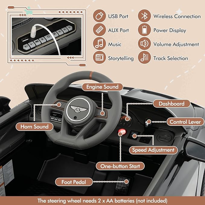• 【Officially Licensed Bentley Bacalar】This licensed Bentley ride-on car features a super cool appearance that appeals to kids a lot. Double doors with locks and gas rods as well as realistic rear mirrors mimic the outlook of a real Bentley. Moreover, 2 × 12V powerful motors and a 12V rechargeable battery ensure profound performance.