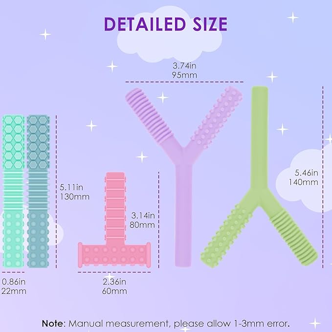 • FUN TEETHING TOYS: Our sensory teething toys set includes 1 pcs T shaped, 2 pcs Y shaped sensory chewy toys and 2 pcs teething tubes, helps keep your kids from chewing on fingers, pencils, hands, clothes, hairs, etc. Reducing stress, anxiety especially when they need to soothe, calm, or focus