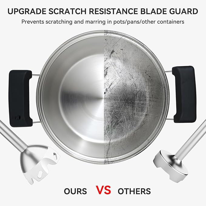 • THOUGHTFUL SCRATCH RESISTANT FEATURE & SAFE: The upgraded hand blender scratch-resistant blade guard design specifically protects non-stick cookware, allowing you to choose any of your pots or pans and no more worry about scratching them. The blender combo is made of BPA-free plastic and 304 stainless steel which is safe, healthy and long lasting.