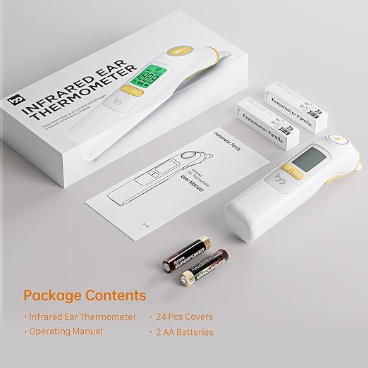 • WHAT YOU GET: Package includes an ear Thermometer, 24 disposable ear muffs, 2 x AA batteries, user manual and a quick guide in your local language, you will also get a 1 year replacement/repair service, during this period, any problem with the product, our customer service team will do their best to help you!