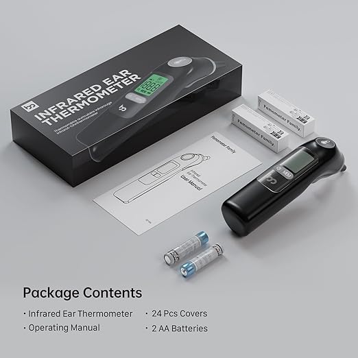 • WHAT YOU GET: Package includes an ear Thermometer, 24 disposable ear muffs, 2 x AA batteries, user manual and a quick guide in your local language, you will also get a 1 year replacement/repair service, during this period, any problem with the product, our customer service team will do their best to help you!