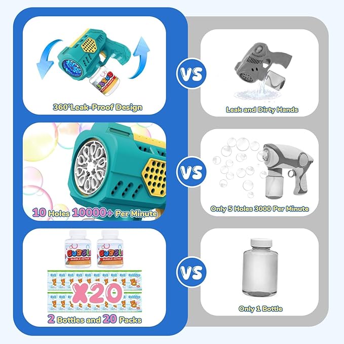 • 【10000+Rich Bubbles Output Per Minute】With a built-in super powerful motor and 10 bubble holes wand, this bubble machine gun churns out over 10,000 bubbles per minute, setting the stage for a mesmerizing spectacle of colorful fun. Kids will delight in the cascade of bubbles, adding an extra dash of joy to their playtime.