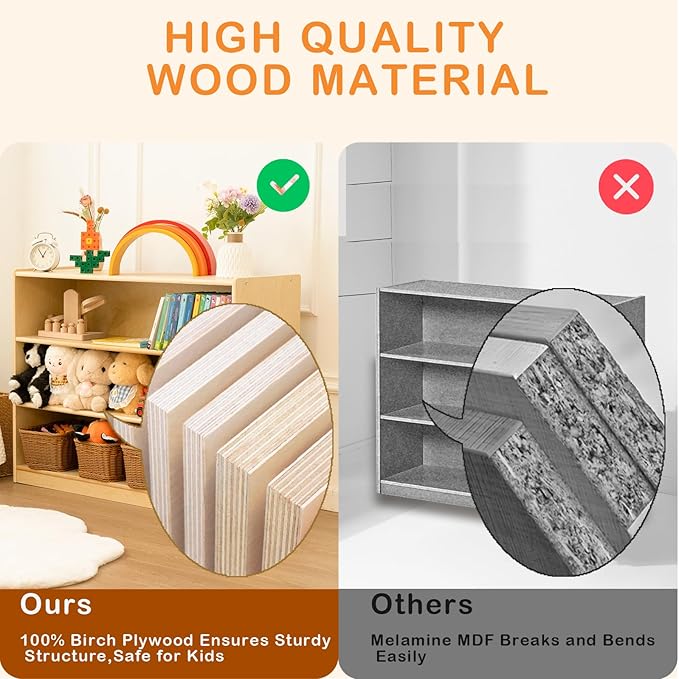 • Premium Birch Wood Quality: Our Montessori shelf is made from 100% birch plywood, ensuring a solid structure. The combination of natural wood texture and multi-compartment space makes it the perfect school or kids room storage solution to keep toys organized. The smooth surface is easy to maintain and wipe with a dry cloth