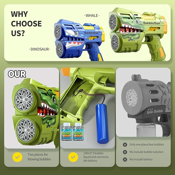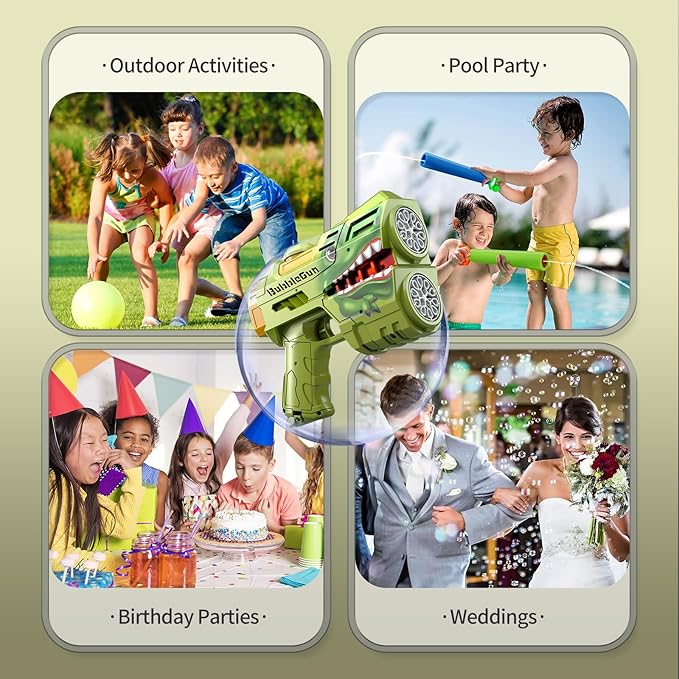 • Upgrade 2 Dinosaur Bubble Gun - The newly upgraded bubble holes, pull the trigger, are full of power, and bubbles are produced crazily. Thousands of bubbles can be produced every minute, doubling the fun! This bubble machine box contains two bubble machine guns of different colors, and the cute dinosaur shape makes children put it down