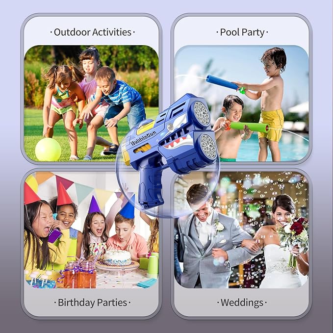 • Ideal Gifts for Any Occasion: The toddlers bubble maker comes in a beautifully packaged box with complete accessories . It is the perfect gift for kids toddlers over three years old. The bubble gun blaster also makes a great bubbles toy bag for these indoor and outdoor occasions, perfect for theme parties, carnivals, birthday parties, camping trips, Halloween, weddings, school classrooms, Easter baskets, outdoor water toy play activities, beaches, backpacking, backyard Bubble party etc.